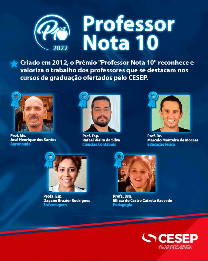E vocês, Professores Nota 10, são os homenageados do ano de 2022 pelo excelente trabalho desenvolvido no CESEP. 💐