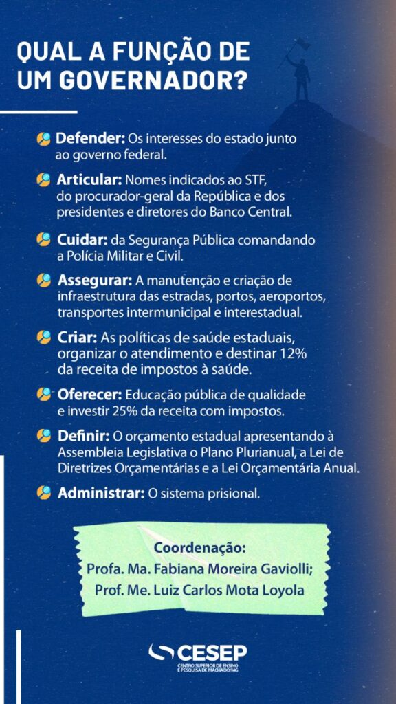 Ontem falamos sobre o cargo de senador. E hoje é dia de entender um pouco melhor sobre o que faz um governador. Vamos lá?!