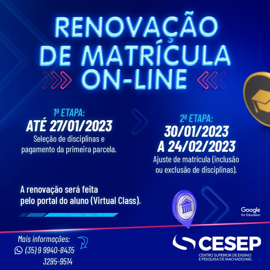 👉 https://cesep.virtualclass.com.br/Index1.jsp - No Menu Principal, clique em “Renovação On-line”;